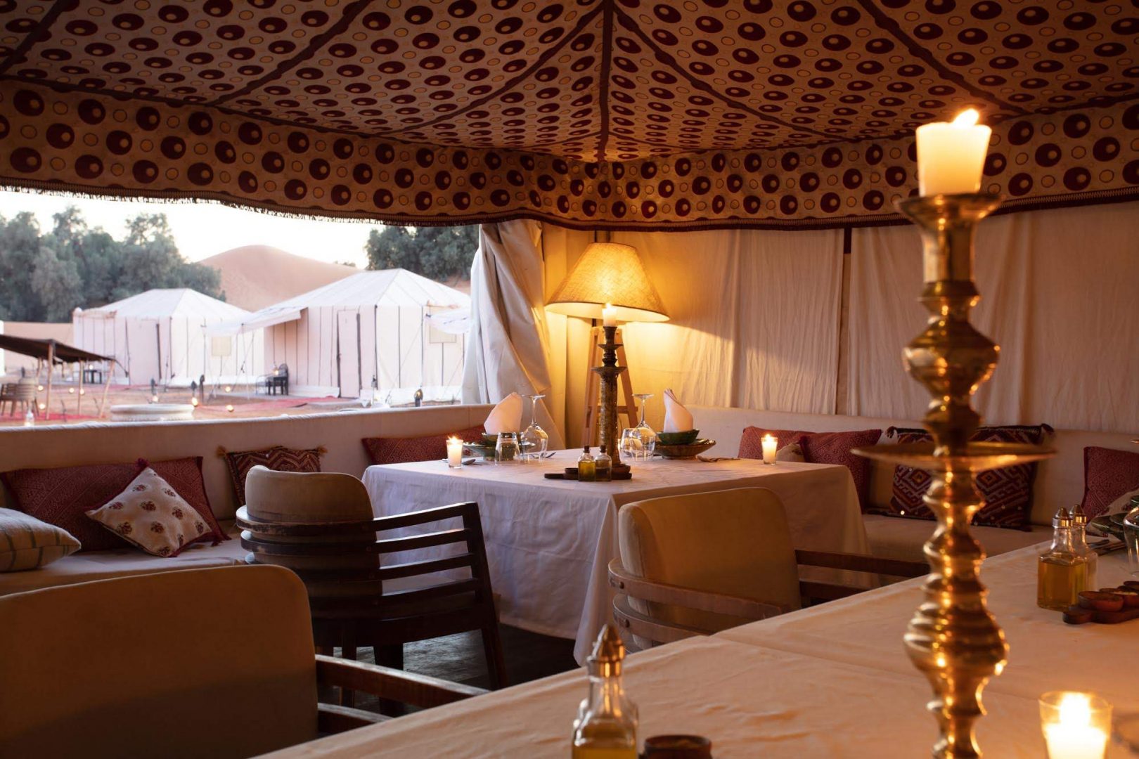 Experience desert luxury at our Merzouga camp, where each private sleeping tent is fully carpeted, lined, and furnished with a comfortable king-size bed and a private en-suite shower and toilet. The camp features a separate dining-salon and ample outdoor space for relaxation. Evenings are spent enjoying the campfire, often with the option to dine outside in warm weather, followed by traditional singing and drumming. Your stay includes dinner, breakfast, drinking water, and a guided camel trek.